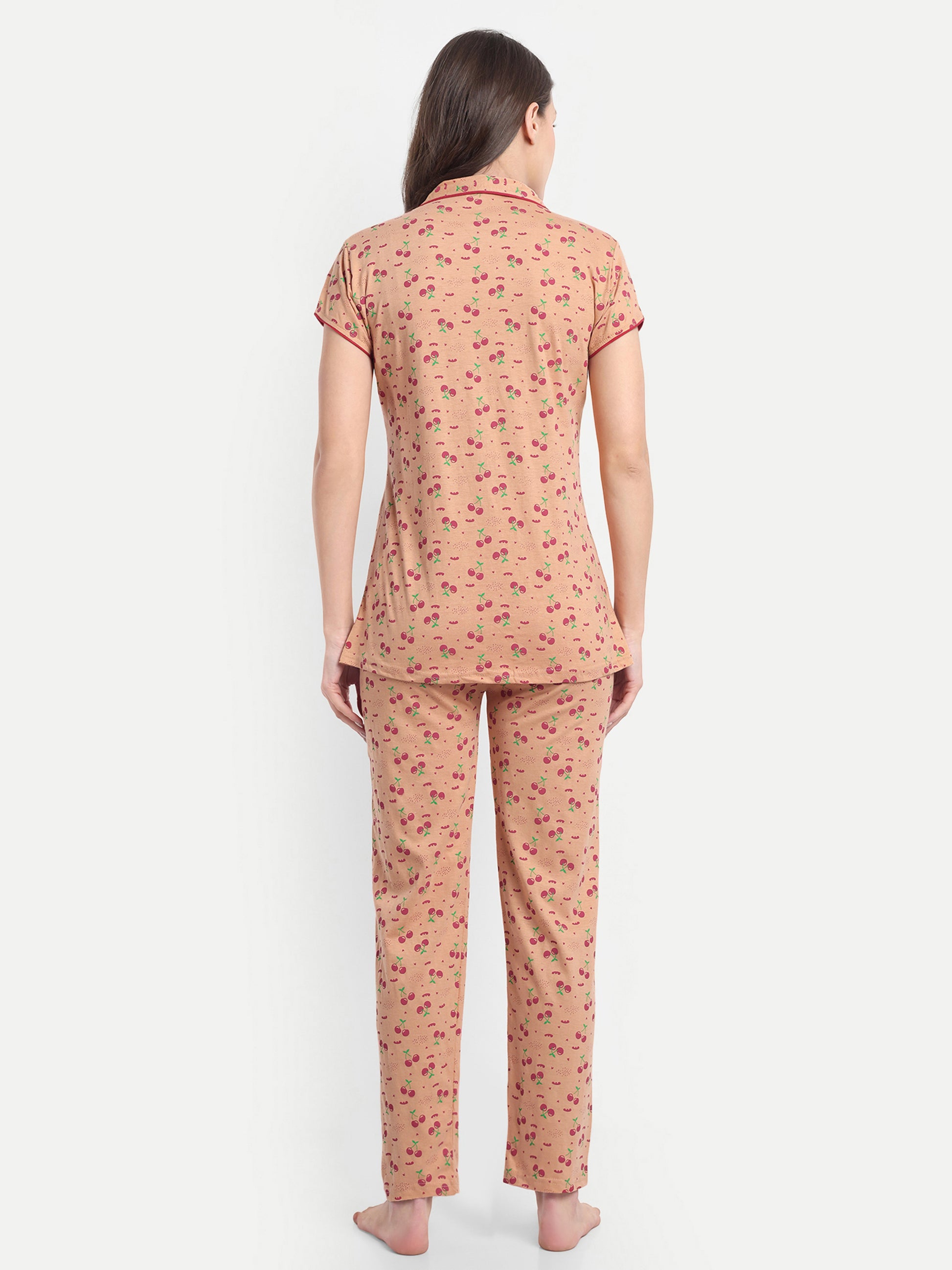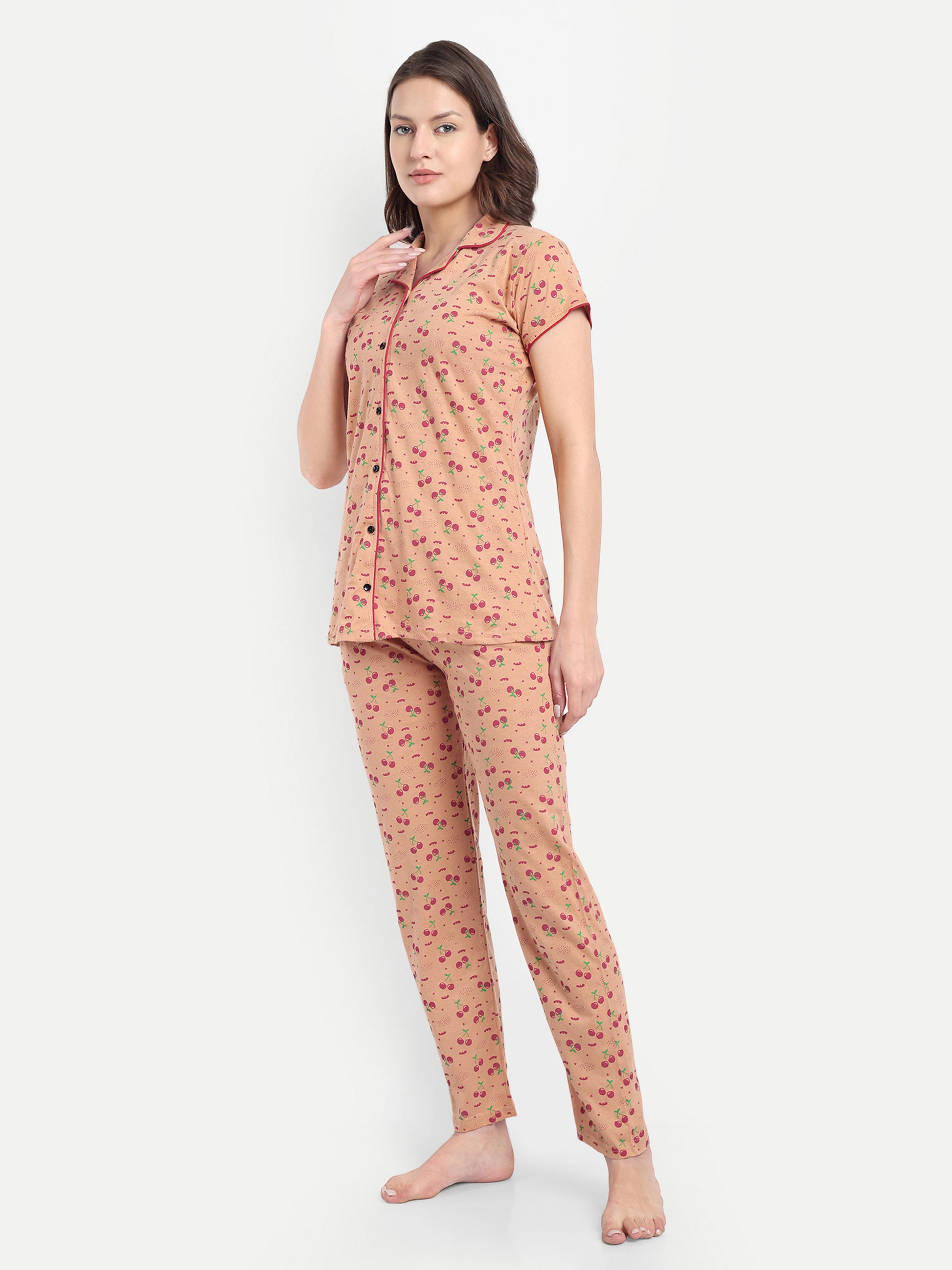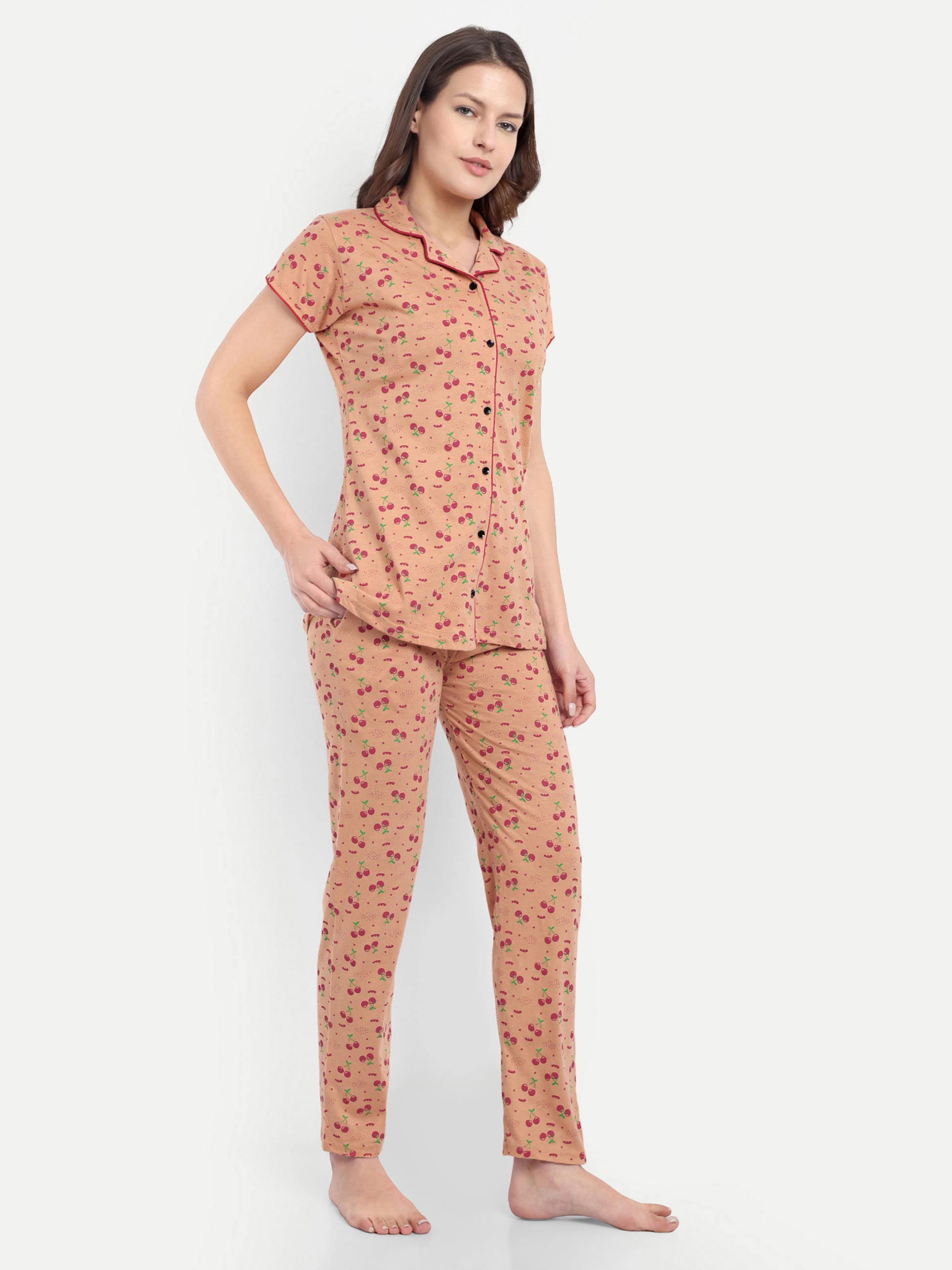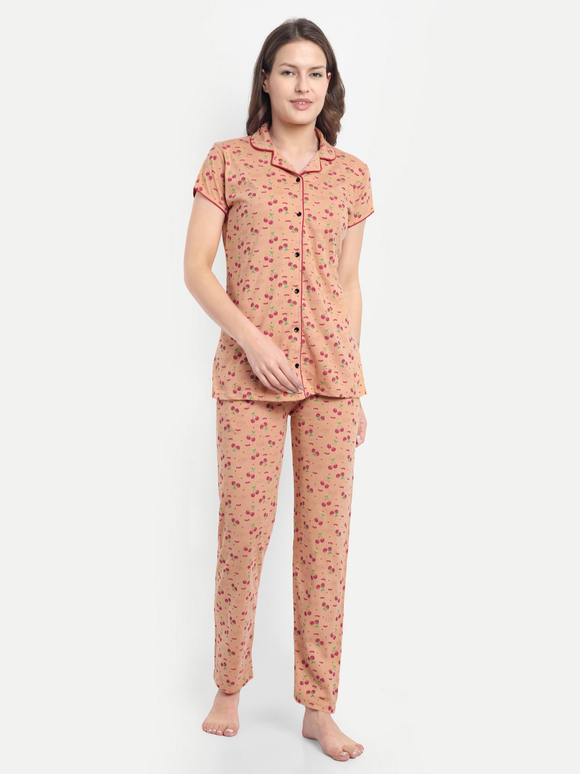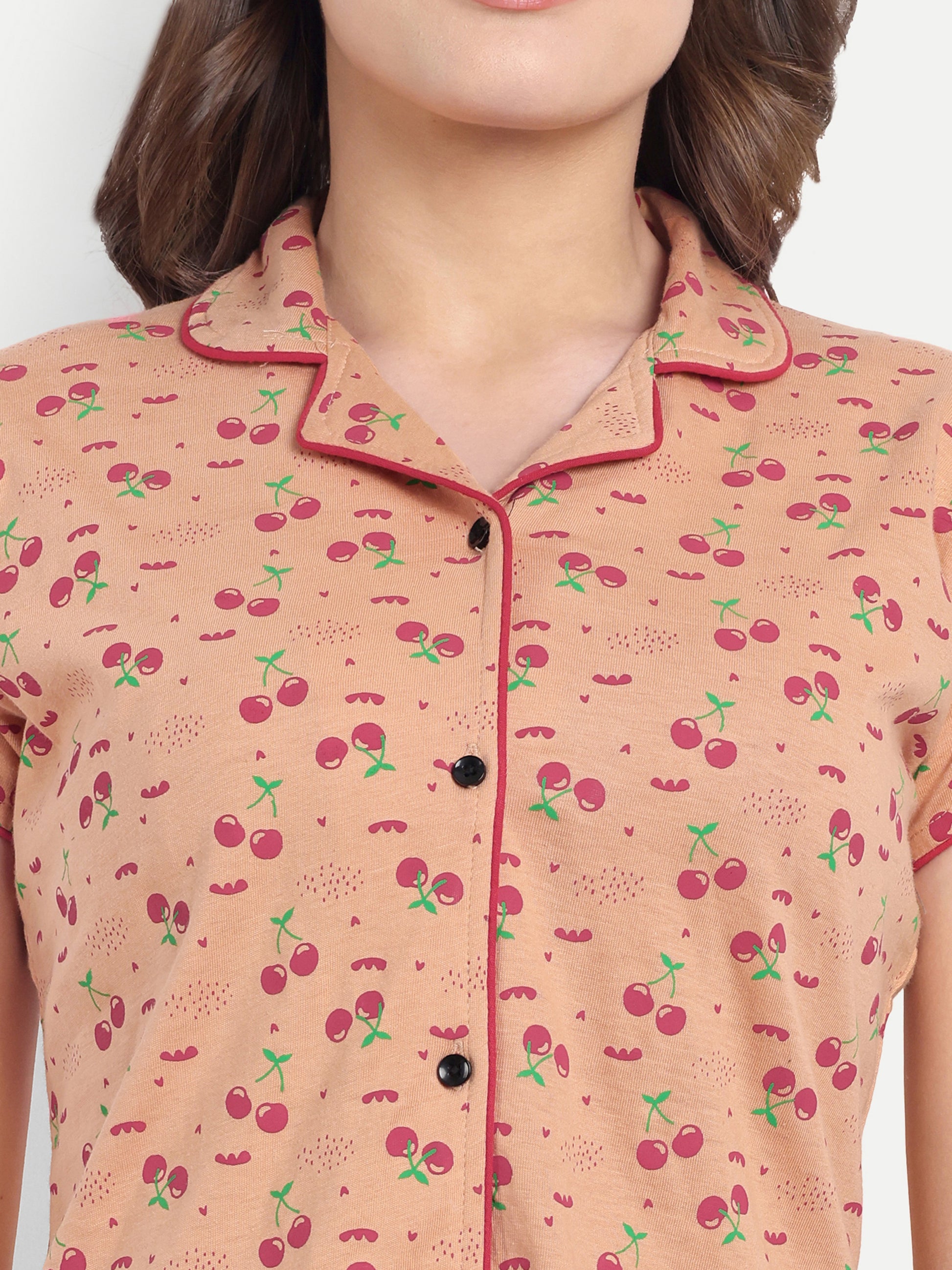 Women's Cotton Cherry Printed Night Suit Set of Shirt & Pyjama (876)